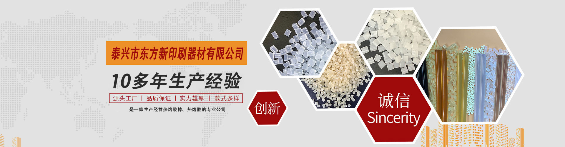 泰興市東方新印刷器材有限公司是專一生產(chǎn)綠色環(huán)保型印刷裝訂書(shū)刊熱熔膠,封箱包裝熱熔膠,吸管膠,鞋材熱熔膠,冰箱熱熔膠,熱熔膠棒,地毯背膠等。產(chǎn)品具有快速粘接、耐老化、強(qiáng)度高、熱穩(wěn)定性好、無(wú)毒害等優(yōu)點(diǎn),廣泛用于無(wú)線膠訂、自動(dòng)化封箱,飲料吸管粘結(jié)接,電子電器、工藝品、玩具、家具等領(lǐng)域,公司與多家科研機(jī)構(gòu)建立了緊密的戰(zhàn)略合作關(guān)系,質(zhì)量達(dá)到先進(jìn)水平,產(chǎn)品已銷往全國(guó)30多個(gè)省市地區(qū),并出品到東南亞多個(gè)國(guó)家和地區(qū)。    公司堅(jiān)持“誠(chéng)信為本,貼心服務(wù)”為廣大顧客提供優(yōu)質(zhì)產(chǎn)品,董事長(zhǎng)兼總經(jīng)理黃衛(wèi)東先生攜全體員工,竭誠(chéng)歡迎各界朋友光臨指導(dǎo)、洽談合作、共贏同發(fā)展。    Taixing Dongfang New Printing Equipment Co., Ltd. specializes in the production of green and environmentall…